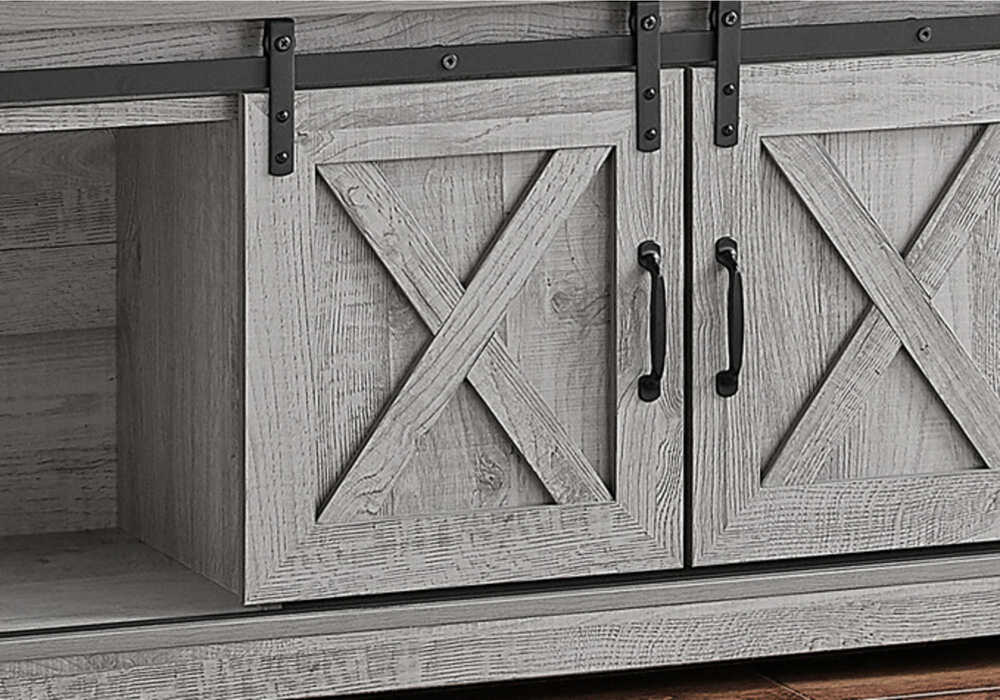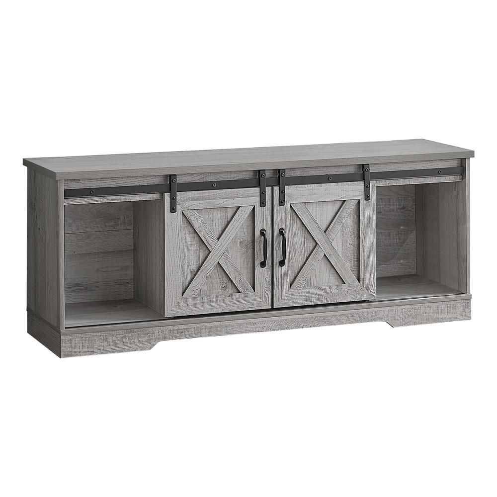TV STAND – 60″”L / GREY/ BROWN RECLAIMED-LOOK/ DARK TAUPE WITH 2 SLIDING DOORS