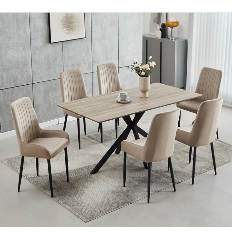 Chairs: Beige Velvet with Stitching Details, Black Steel Legs.