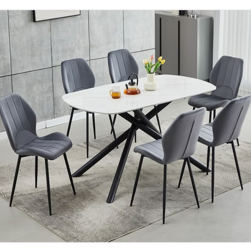 Chairs: Dark Grey Velvet with Stitching Details, Black Steel Legs.