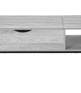 This contemporary style, 42″ long rectangular coffee table with storage, a wood-look laminate grey finish on all sides and a sleek black metal base will be a modern standout in your living space.